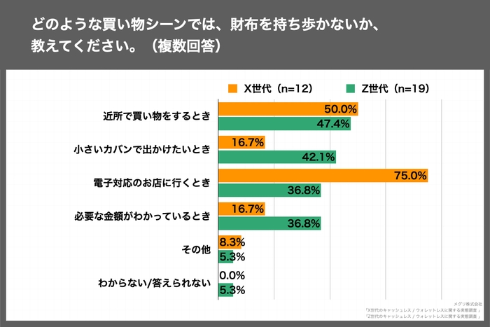 財布を持ち歩かない買い物シーン、X世代では「電子対応のお店に行くとき」が最多。「電子対応」の可否をまず懸念する傾向に。