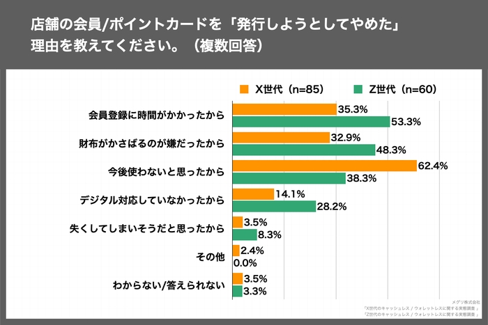 「店舗の会員/ポイントカードを「発行しようとしてやめた」という経験はありますか。」という質問に「何度もある」「数回程度ある」と回答したX世代に、「店舗の会員/ポイントカードを「発行しようとしてやめた」理由を教えてください。(複数回答)」(n=85)と質問したところ、「今後使わないと思ったから」が62.4%で最多、次いで「会員登録に時間がかかったから」が35.3%という結果に。Z世代の理由は「会員登録に時間がかかったから」(53.3%)が最多、次いで「財布がかさばるのが嫌だったから」(48.3%)という結果となった。