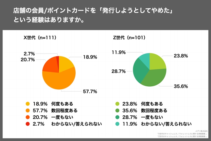 「店舗の会員/ポイントカードを「発行しようとしてやめた」という経験はありますか。」(n=111)という質問に対し、X世代では「何度もある」が18.9%、「数回程度ある」が57.7%と約8割が店舗の会員/ポイントカードを「発行しようとしてやめた」という経験を持ち、Z世代では約6割がポイントカードや会員証発行をやめた経験があった。