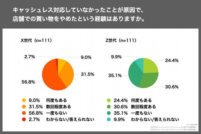 「キャッシュレス対応していなかったことが原因で、店舗での買い物をやめたという経験はありますか。」(n=111)という質問に対し、X世代では「何度もある」が9.0%、「数回程度ある」が31.5%と40.5%が、Z世代では55.0%がキャッシュレス決済未対応のため、店舗での買い物をやめた経験あることがわかった。