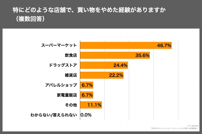 X世代がキャッシュレス決済未対応で買い物をやめた経験、特にスーパーマーケットが最多、次いで飲食店、ドラッグストアなど