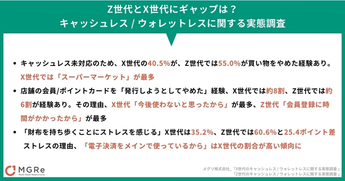 アプリマーケティングプラットフォーム「MGRe(メグリ)」を提供するメグリ株式会社は、関東在住のX世代(42歳〜56歳)111名を対象に、「X世代のキャッシュレス /ウォレットレス実態調査」を実施いたしました。また、この結果を2022年5月に実施した「Z世代のキャッシュレス / ウォレットレスに関する実態調査」と比較調査も行いました。