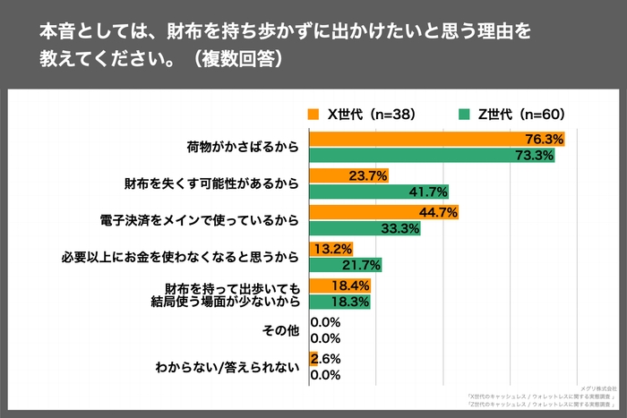 また、X世代の約9割が財布を「常に持ち歩いている」と回答しており、財布を持つことが当たり前であると考えるX世代において「財布を持ち歩くことにストレスを感じる」と回答したのは35.2%でした。キャッシュレス決済を積極的に取り入れる傾向にあるZ世代の回答(60.6%)と比較したところ、Z世代とX世代で25.4ポイントの差の開きがありました。ただ、「財布を持ち歩かずに出かけたいと思う理由を教えてください。(複数回答)」という質問に対し、X、Z世代ともに「荷物がかさばるから」が最多でしたが、