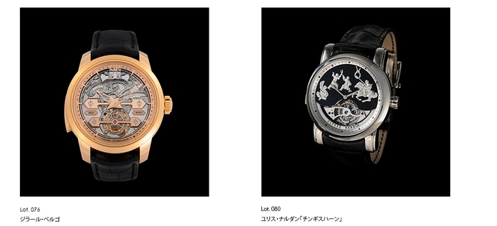 ■その他、時計ではトゥールビヨン、ミニッツリピーターを搭載したジラール・ペルゴ「ゴールデンブリッジ」、ユリスナルダン「チンギスハーン」、ロレックス、フェルナント・ベルトゥーの希少モデルが出品される。