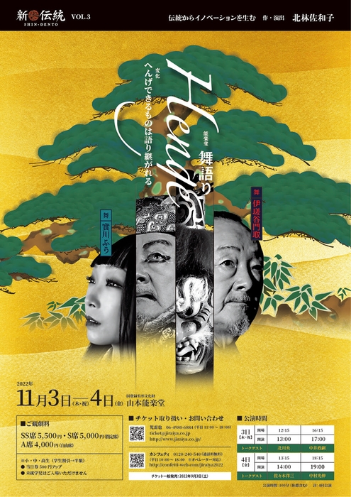 JIRAIYA 新伝統vol.3 能楽堂 舞語り『Henge』へんげできるものは語り継がれる が2022年11月3日 (木・祝)~11月4日 (金)に山本能楽堂(大阪市中央区)にて上演されます。チケットはカンフェティ(運営:ロングランプランニング株式会社、東京都新宿区、代表取締役:榑松 ⼤剛)にて発売中です。