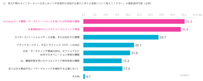 ファーストパーティーデータ構築やデータクリーンルーム等のプライバシー規制対応や、企業戦略含めたビジネスコンサルティング領域が重要だという回答が多かった。