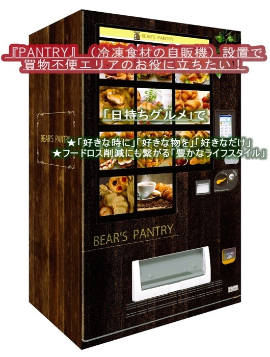 オンラインショップにて各種ハイクオリティな冷凍食材などを販売し、「日持ちグルメ」による「豊かなライフスタイル」提案をしている株式会社BEAR'S PANTRY(本社:神奈川県横浜市、代表:安部 博之)は7月7日(木)、勾配が多く高齢者らにとって買い物が不便な地域に冷凍食材「日持ちグルメ」の自動販売機(以下、「PANTRY」)を設置する事業資金のため、クラウドファンディングサイト「CAMPFIRE」にて資金の募集を開始しました。「PANTRY」1号機は、横浜市青葉区に設置する予定で、ゆくゆくは同市内及び近隣エリアや全国に拡げていくことを目指します。