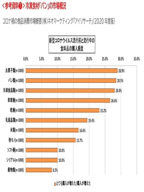 ・「購入頻度増の食品」 1位「菓子」16% 、2位「冷凍食品」 15.9%、3位「パン」15.2%