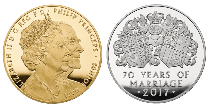 記念貨の発行にあたり、英国王立造幣局は、ジョージ王子誕生記念貨やシャーロット王女洗礼式記念貨など、歴代の皇室記念貨のデザインを手がけた、英国王立造幣局と縁の深いデザイナーの一人、芸術家ジョン・バーグダルに2種類の裏面デザインの制作を依頼しました。一つはダブルシールド(2枚の盾)のデザイン、もう一方はご夫妻の乗馬姿のデザインです。また表面には、彫刻家のエティエンヌ・ミルナーによる女王とフィリップ殿下ご夫妻の特別な肖像画が描かれています。