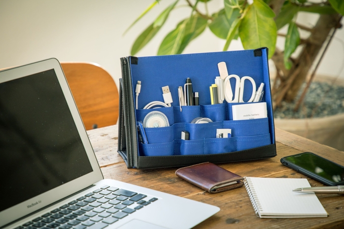 ワークアイテムキャリー「sussu stand by」は、文具だけでなくタブレット端末やパソコン周りのガジェット、メガネ、化粧小物等も収納可能で、3段のポケットにより文具や小物等を高さ別に収納することができ、パッと見るだけでどこになにがあるのかがすぐわかかるため、探す手間がありません。また、ふたがスタンドの役目をするので、デスクの上で自立し、ふたを閉じれば、持ち歩くことができます。厚さ3.5cmのスリムボディで、持ちやすくバッグの中ですっきり収まります。