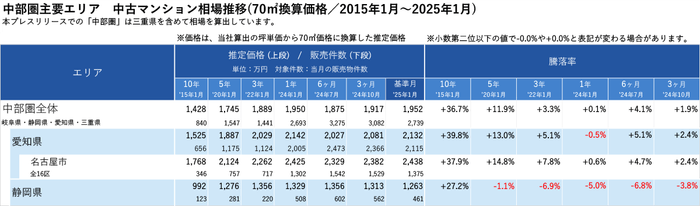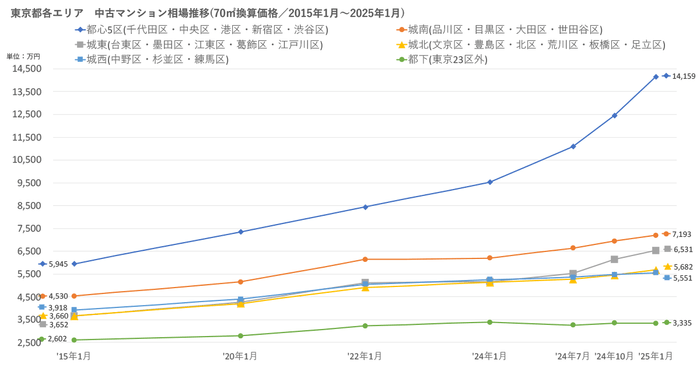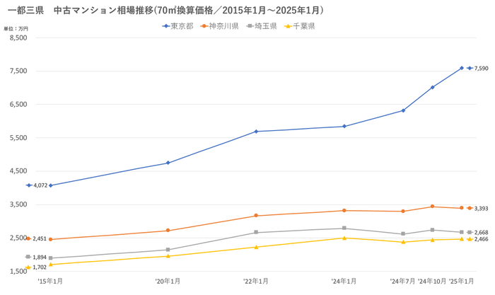 「不動産×WEB×ビッグデータ」の領域で、さまざまな不動産テックサービスを展開する株式会社ワンノブアカインド(本社:東京都港区、代表取締役社長:川島 直也、以下当社)は、当社が運営しているマンション情報サイト「マンションレビュー」の保有データを元に、全国の2025年1月の中古マンション相場を調査。坪単価をベースに70㎡での価格に換算した「中古マンション価格」*1について、10年前・5年前・3年前・前年からの推移を都道府県別・エリアごとにまとめましたので、発表いたします。
