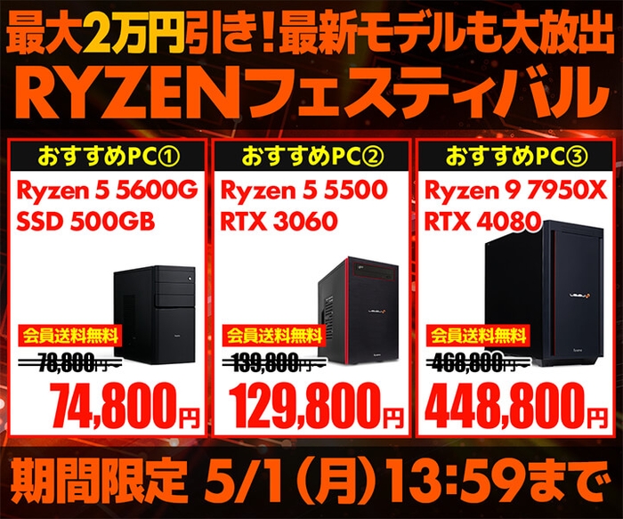 『RYZENフェスティバル』を実施中です。「Ryzen 9 7950X」「「Ryzen 9 7950X」「Ryzen 9 7900X」「Ryzen 7 7700X」「Ryzen 5 7600X」「Ryzen 7 5700X」「Ryzen 7 5700G」「Ryzen 5 5600X」「Ryzen 5 5600G」「Ryzen 5 5500」搭載のBTOパソコンを、最大20,000円引きでご用意しております。