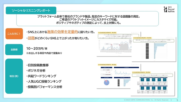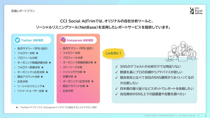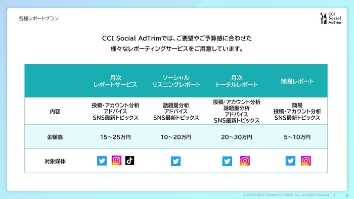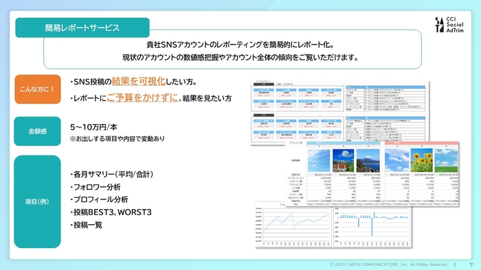 株式会社CARTA HOLDINGSのグループ会社である株式会社CARTA COMMUNICATIONS(東京都中央区、代表取締役社長:目黒 拓、以下「CCI」)は、2023年7月、SNS運用企業に向けたレポート支援プランの提供を開始しました。
