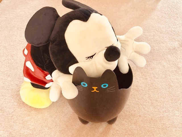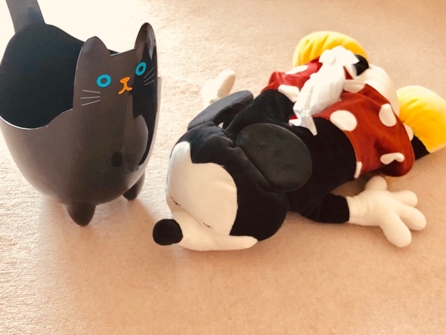 先ほどから辛そうな風邪を引いたミニーちゃんは実はティッシュカバー!猫ちゃんはゴミ箱なんです!