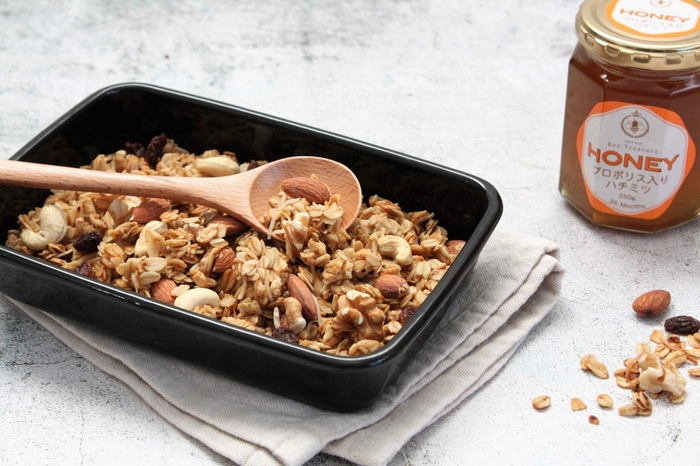 蜂の宝本舗こだわりのプロポリス入りハチミツを使用したレシピが、公式HPトピックスにて公開されています。第一弾レシピは食物繊維や鉄分が豊富で、美味しく食べられる「香ばしココナッツハニーグラノーラ」。管理栄養士の倉田祥子さん監修の身体に優しい美味しいレシピです。
