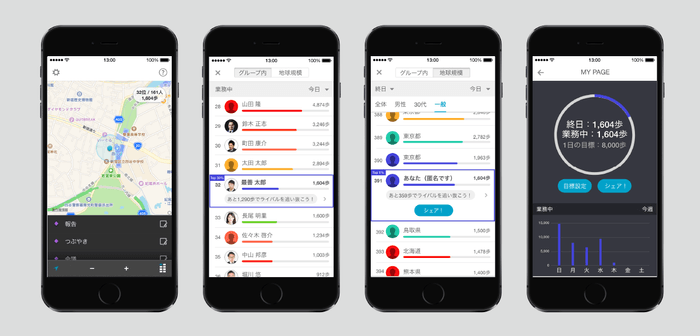 この度追加された新機能は、業務時間中の歩数がアプリによってカウントされ、指定期間での自分の歩数推移やランキングが閲覧可能となります。この結果、従来売上結果での評価が主だった営業担当者、さらには営業担当者をマネジメントする側が、新しいKPIとして「業務時間中の歩数」を活用し営業担当者のプロセスを定量的に評価することが可能となります。また、トップ営業マンの営業プロセスを社内で共有し、営業活動と結果の相関性を分析することができるため、営業現場の生産性向上につなげることができます。さらに、営業担当者のモチベーション向上や行動することの楽しさを感じていただけるよう、自身で目標を設定したり歩数の成果をSNSでシェアする機能も追加しています。