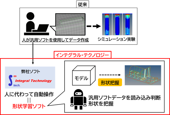 弊社ソフトは、シミュレーション実験⽤データ作成ソフトを⼈に代わって⾃動運転致します。PC 画⾯の形状を⾃動で認識し、形状にあった操作を⾏います。操作結果の判定も⾃動で行い、問題があれば修正致します。人の工数を多く必要とせず、シミュレーション作業の90%以上の⼯数割合となるモデリングを 80〜 95%短縮致します。近年では、AI技術を用いたメッシュ生成の開発に取り組んでおり、更なる形状認識・メッシュ生成の高速化に勤しんでいます。