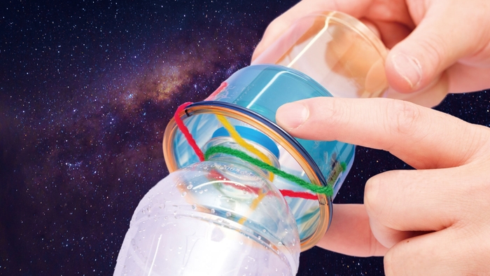 宇宙の実験場、国際宇宙ステーションには大きなロボットのうでが付いている。このロボットアームはふしぎなしくみでモノをつかむんだ。実際につくって動かしてみよう!