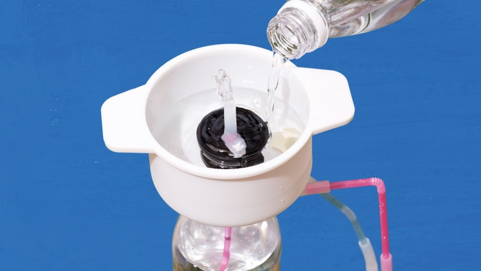 これは約2000年前の発明家・ヘロンが考えたふしぎな装置。水をくみ上げるしくみはないのに、水を注ぐだけで水がわき出てくる! どういうしくみか、わかるかな?