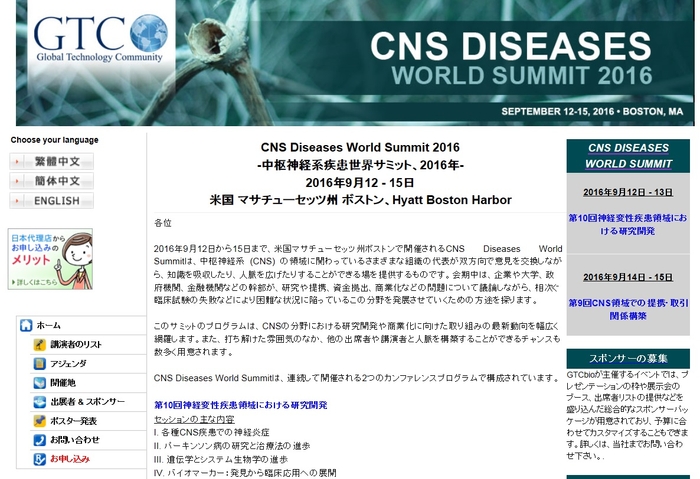 国際学会 「CNS Diseases World Summit 2016-中枢神経系疾患世界サミット 2016年」(GTCbio主催)の参加お申込み受付開始
