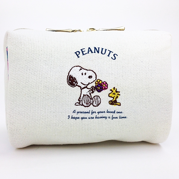 花束を持ったスヌーピーとウッドストックの笑顔にほんわか癒される、帆布生地のスクエアポーチは普段使いにぴったり。