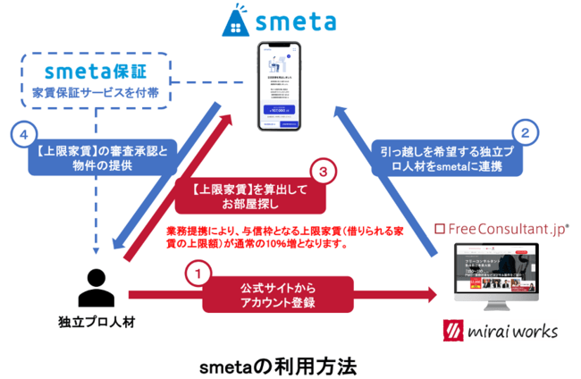 今回、フリーランスが抱える不動産賃貸領域における与信課題を解消し、豊かな生活を送れるよう支援していきたいという思いから、この度の提携に至りました。みらいワークスの「フリーコンサルタント.jp」の登録者は、当社アプリ「smeta」を通じて、賃貸住宅を借りるために必須となる信用(家賃保証サービス)と賃貸物件情報をワンストップで得られ、入居審査に落ちることなく賃貸住宅をご契約いただけます。