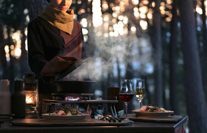 当ディナーを提供するのは、赤松の木々に囲まれた屋外ダイニング「フォレストキッチン」です。ランタンやタープ、ブランケットなどが設えられ、春の気持ちの良い気候の中、快適にディナーを楽しめます。料理は、アウトドア器具を使用しながら自身で仕上げを行います。おいしく仕上がる調理方法を熟知したグランピングマスターがサポートするため、アウトドア器具の扱いに慣れていない方でも安心です。