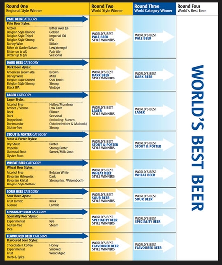 ■審査形式:8カテゴリーにビアスタイルごとに出品されたビールをブラインドテイスティングにより評価し、4つのステージを経て最終的に「ワールド・ベスト・ビール」を決定