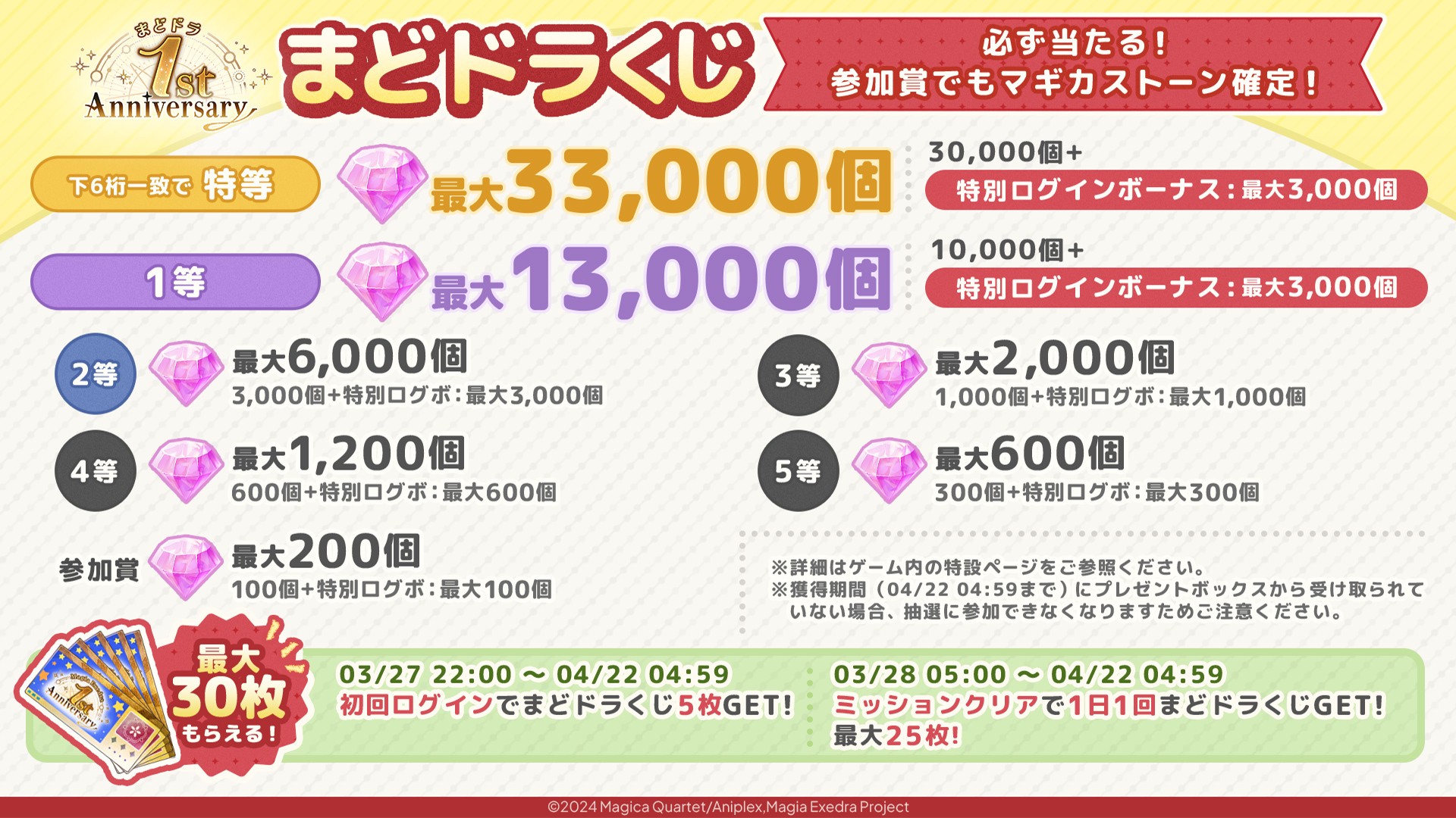 特等当選でマギカストーン33,000個を手に入れることができ、参加賞でも必ずマギカストーンが当たる「1st Anniversaryまどドラくじ」が開催中です。「まどドラくじ抽選チケット」は1枚ごとに番号が記載されており、その番号と当選番号が見事一致した場合、一致した等の景品が獲得できます。