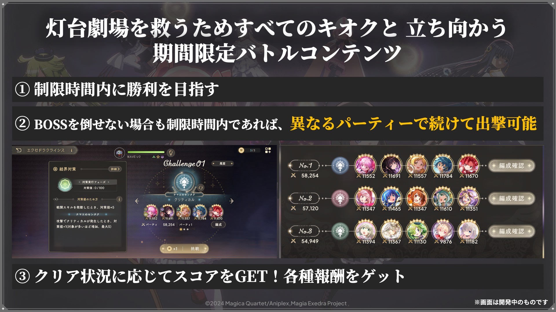 株式会社アニプレックス(本社:東京都千代田区 代表取締役 西本修 以下アニプレックス)は、『魔法少女まどか☆マギカ Magia Exedra』(Magia Exedra:マギアエクセドラ)において、4月1日(水)12時より、灯台劇場の新バトルコンテンツ「エクセドラクライシス」を実装し、「エクセドラクライシス」 Season 1を開始いたしました。
