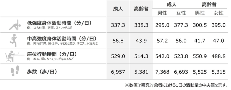 成人の中高強度身体活動時間は1日56.8分 家事や立ち仕事などの低強度身体活動時間は 男性4.9時間/日、女性6.3時間/日 計測機器を用いた国内初の全国調査の報告書を発刊