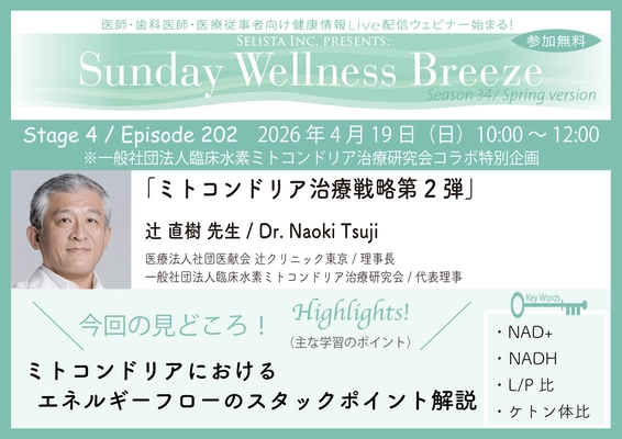 《医師・歯科医師・薬剤師向け》 無料オンラインセミナー4/19(日)朝10時開催 『ミトコンドリア治療戦略第2弾』辻 直樹 先生 (医療法人社団医献会 辻クリニック東京 / 理事長)
