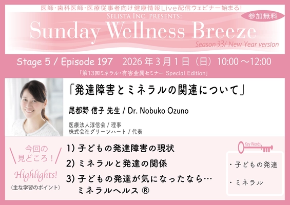 Selista Inc. Presents. 『Sunday Wellness Breeze』Season 28 New Year version 第12回ミネラル・有害金属セミナー Special Edition 全6 Stage 2025年1月19日(日)~3月9日(日)の日曜日の朝に開催