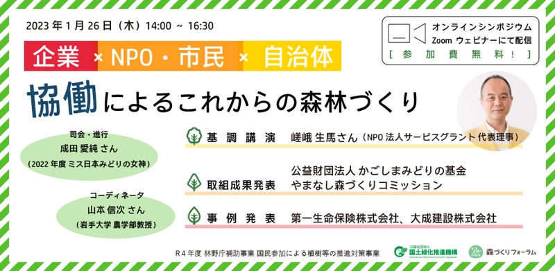 企業×NPO・市民×自治体のオンラインイベントを1月26日に開催 森林保全と協働をテーマに企業の事例等を紹介