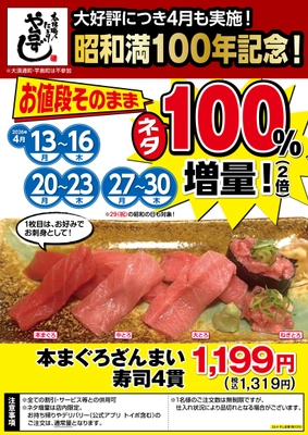 昭和満100年を記念して! 本格職人握り寿司居酒屋「や台ずし」が 本まぐろざんまい寿司4貫のネタ100%増量キャンペーンを 税込1,319円で2026年4月13日(月)~16日(木)、 20日(月)~23日(木)、27日(月)~30日(木)の計12日間限定実施!