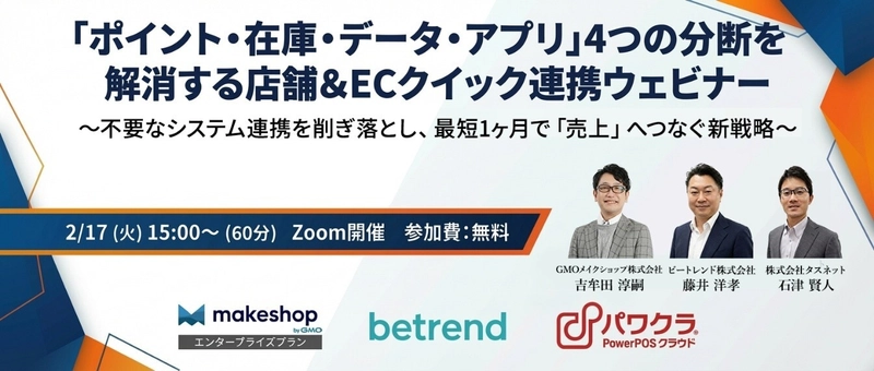 【2/17開催】 「ポイント・在庫・データ・アプリ」4つの分断を 解消する店舗&ECクイック連携ウェビナー