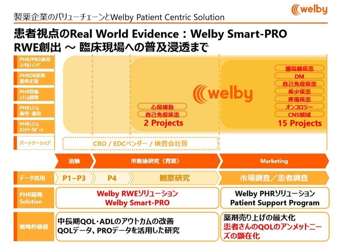 病気と向き合う人々の健康管理を支援する株式会社ウェルビー(本社:東京都中央区、代表取締役:比木 武、以下 ウェルビー)は、本日より臨床研究領域を対象としたPRO(Patient Reported Outcome、以下 PRO)エビデンス創出ソリューション「Welby Real World Evidence(RWE)ソリューション」の提供を開始しました。様々な疾患領域で患者さんの治療を支援するPHR(Personal Health Record、以下 PHR)サービスを提供してきたソリューション開発の実績とID・DB基盤を活かし、臨床研究を対象としてPHR / PROを活用したエビデンス創出の相談から、PHR / PROの収集システム開発・運用、機器の運用支援までをパートナー企業と連携してサービスを提供します。また、ウェルビーはメディデータ・ソリューションズ株式会社が臨床試験アプリの構築企業として認めるアジア唯一のApp Connect Partnerであり、Medidata Clinical Cloudで稼働するカスタムアプリの開発も可能です。