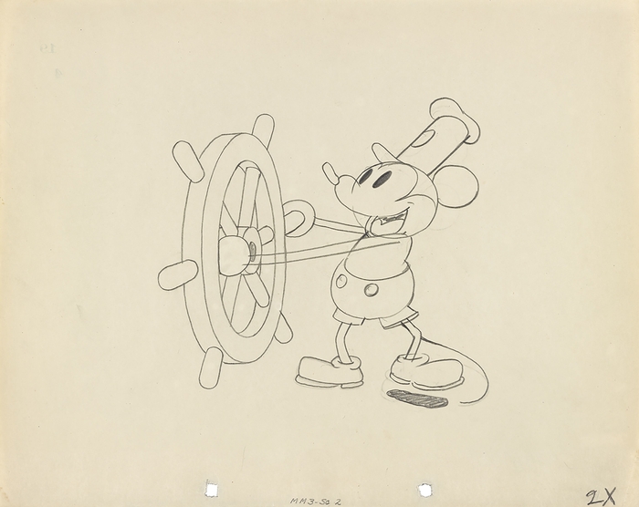 ミッキーマウスの公式デビュー作は1928年に公開された『蒸気船ウィリー』です。じつはその少し前に、ミッキーマウスの真のデビュー作とも言うべき『プレーン・クレイジー』という作品が作られています。事情があり公開の順番は前後しましたが、この両作品の貴重な原画を、同時初公開します。とても90年近く前に描かれたとは思えない、鮮やかな鉛筆画のタッチをじっくりとご覧ください。