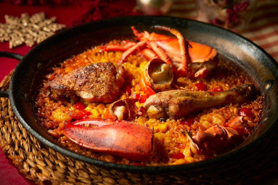 米料理は「ホロホロ鶏とオマール海老のパエリア」。旨味の詰まったオマール海老と、皮をパリッと香ばしく焼き上げ、ジューシーに仕上げたホロホロ鶏のごちそうパエリアです。食べこたえのある、贅沢なパエリアに仕上げました。最後のお茶菓子として、スペインの伝統的なクリスマス菓子「トゥロン」と「ポルボロン」をお出しします。クリスマスならではの正統派スペイン郷土料理を、ランチまたはディナーコースでお楽しみください。本場スペインさながらのお料理、雰囲気をお楽しみいただけます。大切な方々と心温まるお時間をお過ごし下さい。