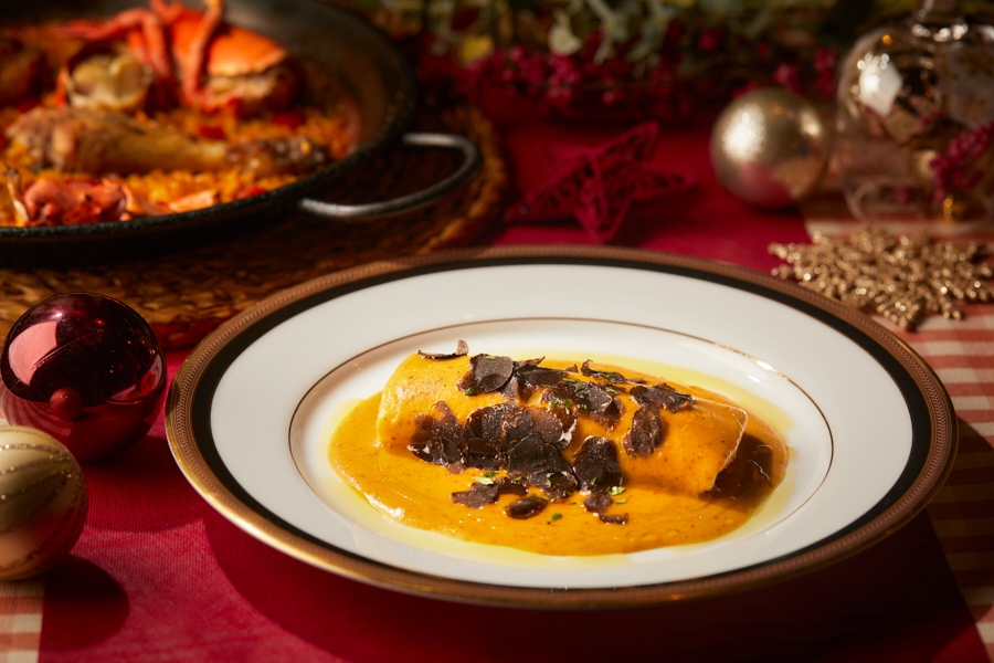 毎年恒例のクリスマス限定で味わえる「カネロネス」は、温前菜としてお出しします。牛タン、うずら、豚肉をパスタの生地で包んでいます。今年は卵黄とナッツ、サフランを効かせたぺピトリアソース仕上げにし、トリュフを散りばめ、香り豊かにエレガントに仕上げました。