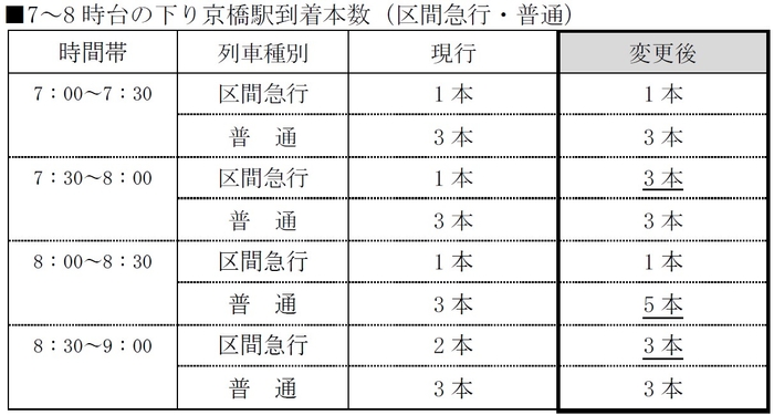 ・7~8時台下り(大阪方面行き)について、混雑緩和のため「区間急行」・「普通」の合計5本(京橋駅到着本数)を増発します。