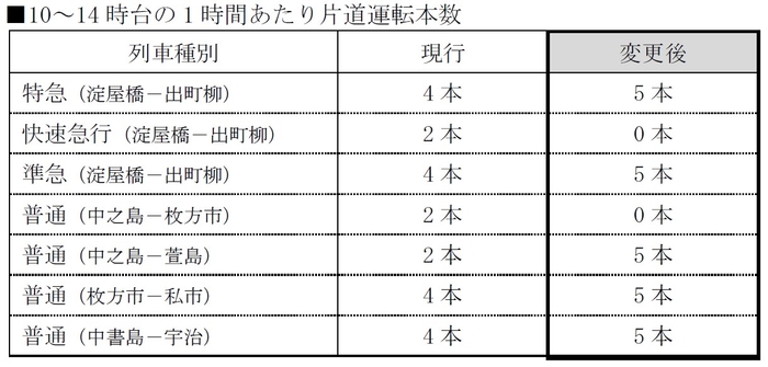 今回のダイヤ変更では、昼間時間帯の運転パターンについて、各列車種別を約 12分間隔(現在は15分間隔)に変更し、お客さまの利便性向上を図ります。淀屋橋・中之島~萱島間において、昼間・夜間時間帯はご利用状況に鑑み、「普通」について4両編成を主体とした運転とします。朝夕ラッシュ時にも一部列車を除き「区間急行」「普通」を4両編成で運転し、一方で、輸送力確保や混雑緩和を図るため増発します。 また、主に京都方面での大学生の通学時間帯における混雑緩和のため、出町柳駅発着の列車を増発します。