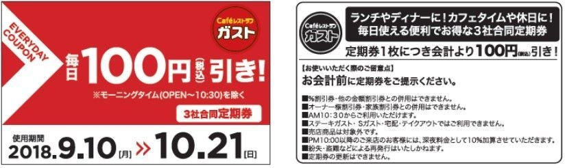 株式会社すかいらーくレストランツ(本社・東京都武蔵野市、代表取締役社長 崎田晴義)が運営する国内最大、全都道府県に店舗を構えるファミリーレストラン「ガスト」は、株式会社はなまる、株式会社吉野家と連携し、2018年8月27日(月)よりガストにて、お会計が毎日100円(税込)引きになる「3社合同定期券」を販売いたします。