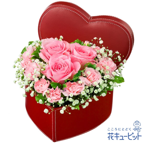 特別な贈り物には、ロマンチックなバラがぴったり。ハート型のボックスに、可愛らしいピンクバラを美しく飾りました。ピンクバラの花言葉は「感謝」。あなたの気持ちをまっすぐ伝えます。