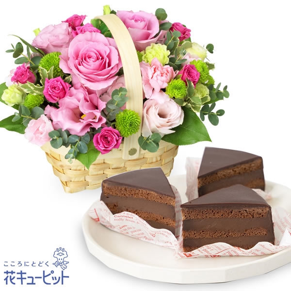 【ピンクバラのウッドバスケットアレンジメントと魅惑のザッハトルテ(カット)3個入】