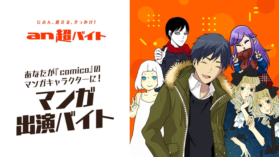 世界累計2,700万ダウンロードを突破した人気マンガ・ノベルサービス「comico」と、「an超バイト」の新コラボ企画!「comico」の作品のマンガキャラクターになれる“マンガ出演バイト”を大募集します。