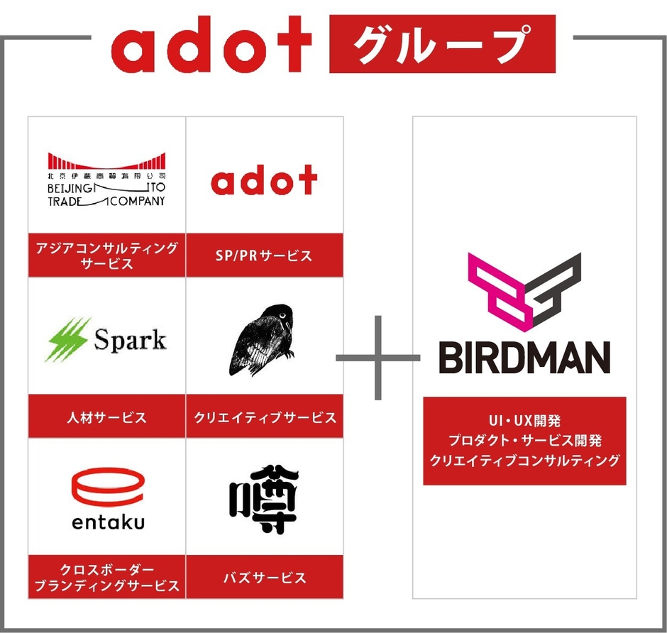 こうした考えのもと、BIRDMANがadotグループにジョインすることとなりました。BIRDMANが広告制作で培った発想やアイデアがadotに新たに加わることで、有機的な顧客提供価値を生み出し、さらなる事業成長を遂げることができると確信しています。