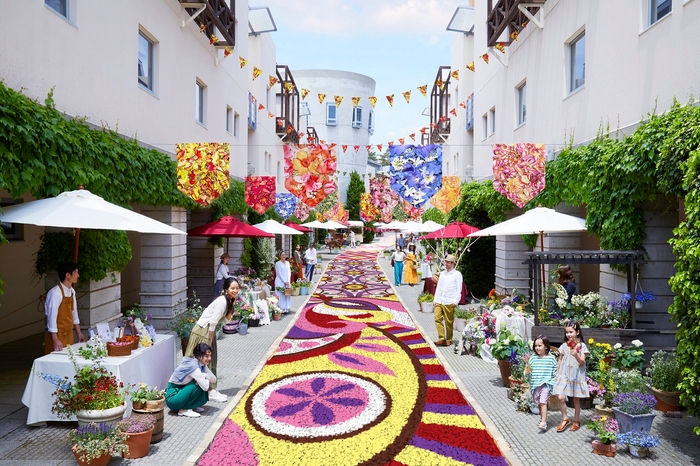 「回廊の花咲くリゾナーレ」は、今回で19回目となる春の定番イベントです。全長160メートル続く花の装飾で、ホテルのメインストリート「ピーマン通り」を色鮮やかに彩ります。今回は、ピーマン通りの上部に「風に舞う花びら」をテーマにした装飾が新登場します。また、花束をイメージした「花咲くコットンキャンディブーケ」の提供や花を使ったクラフト体験も開催。花があふれるピーマン通りで春のひとときを過ごせます。