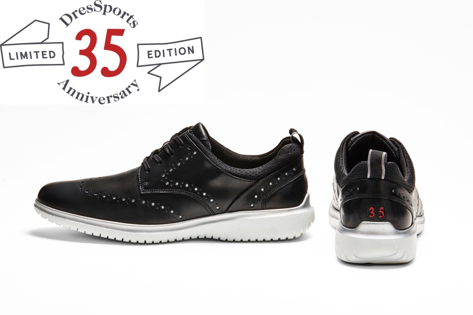 この記念モデルは、「DresSports」の最大の魅力である片足約265gという驚きの軽さ、スニーカー並みの屈曲性、truTECH(トゥルーテック)搭載による歩行時の衝撃吸収性などの優れた機能はそのままに、記念モデルならではのディテールにこだわったスポーティなデザインが特長です。アッパーはブラックのレザーに、リフレクター(反射)仕様のシルバードットでクラシックなブローギングを施し、生体力学に基づいてデザインされたホワイトのEVAアウトソールには、シルバーのラインでアクセントを加えています。そして、踵部分には「DresSports」のヘリテージをたたえる「35」の文字が刻まれています。