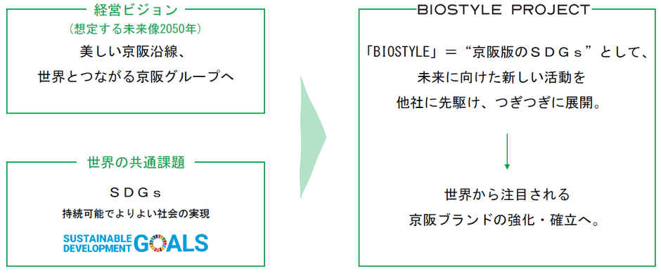 京阪グループでは、2018年5月に発表した「長期戦略構想」において、「経営理念」に基づき、健康的で美しくクオリティの高い生活を実現し、循環型社会に寄与するライフスタイル「BIOSTYLE」を中心に社会課題の解決に資する商品・サービス・事業を創造するとともに、ESG(環境・社会・ガバナンス)に配慮した事業活動を強化することにより、SDGs(持続可能な開発目標)達成に貢献し、社会と調和した持続的成長を目指しています。